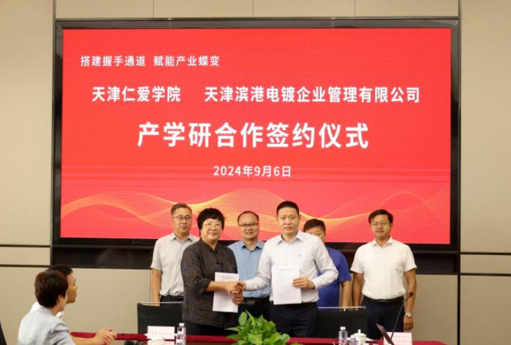 為深入貫徹落實習近平總書記視察天津重要講話精神,扎實實施科教興區、人才強區行動,加速推動科技成果向新質生產力轉化,不斷塑造高質量發展新動能新優勢。9月6日,在金茂源天津表面處理園區,天津仁愛學院與天津濱港電鍍企業管理有限公司進行產學研合作簽約儀式。天津市靜海區副區長楊晨光、天津仁愛學院副校長張俊紅出席會議,靜海區科技局、工業局和信息化局、中旺鎮相關負責同志及天津園區龍頭企業參加活動。